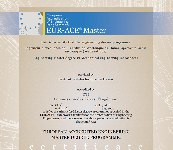 Chương trình Thạc sỹ Cơ khí hàng không PFIEV được kiểm định thành công năm 2016 bởi CTI