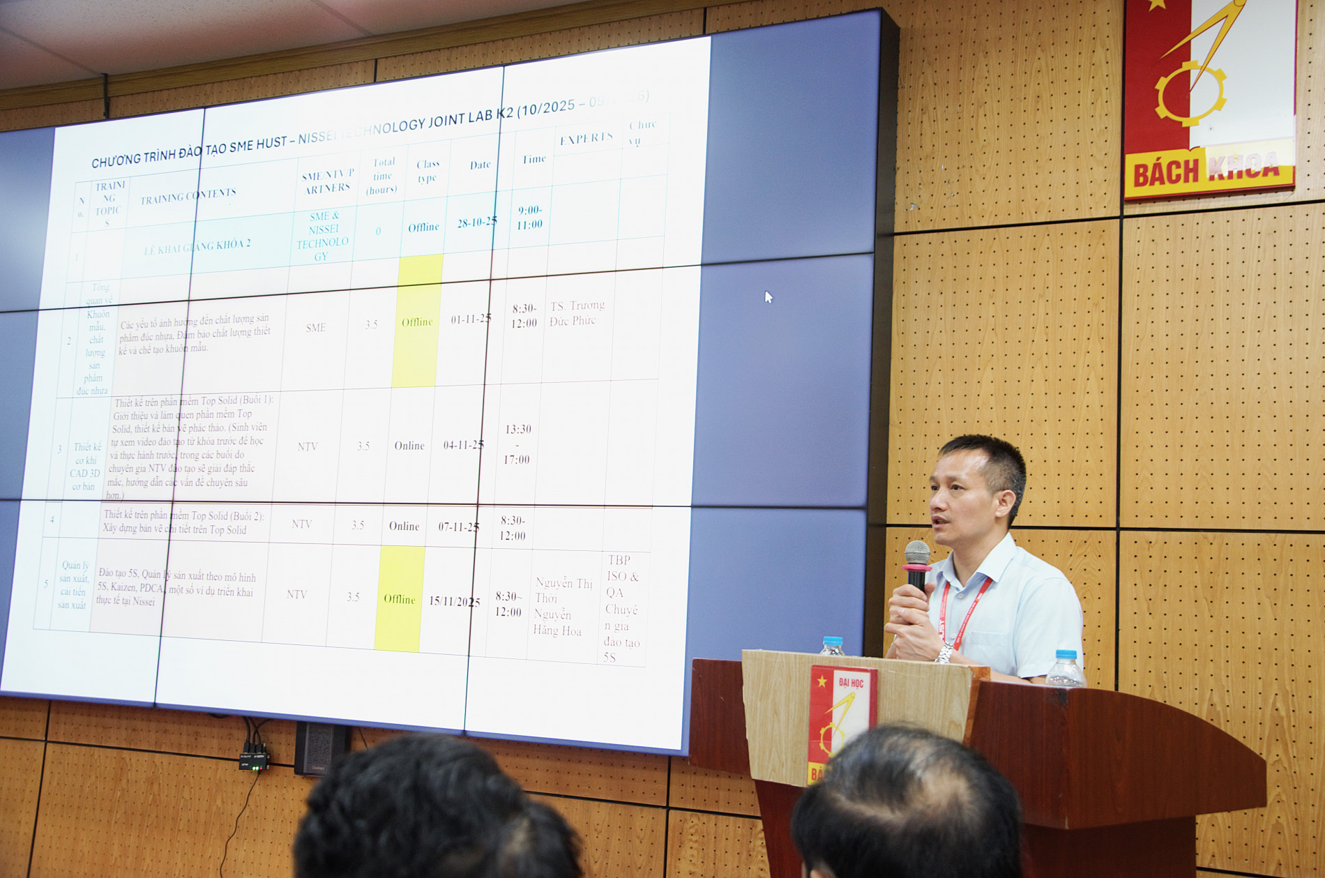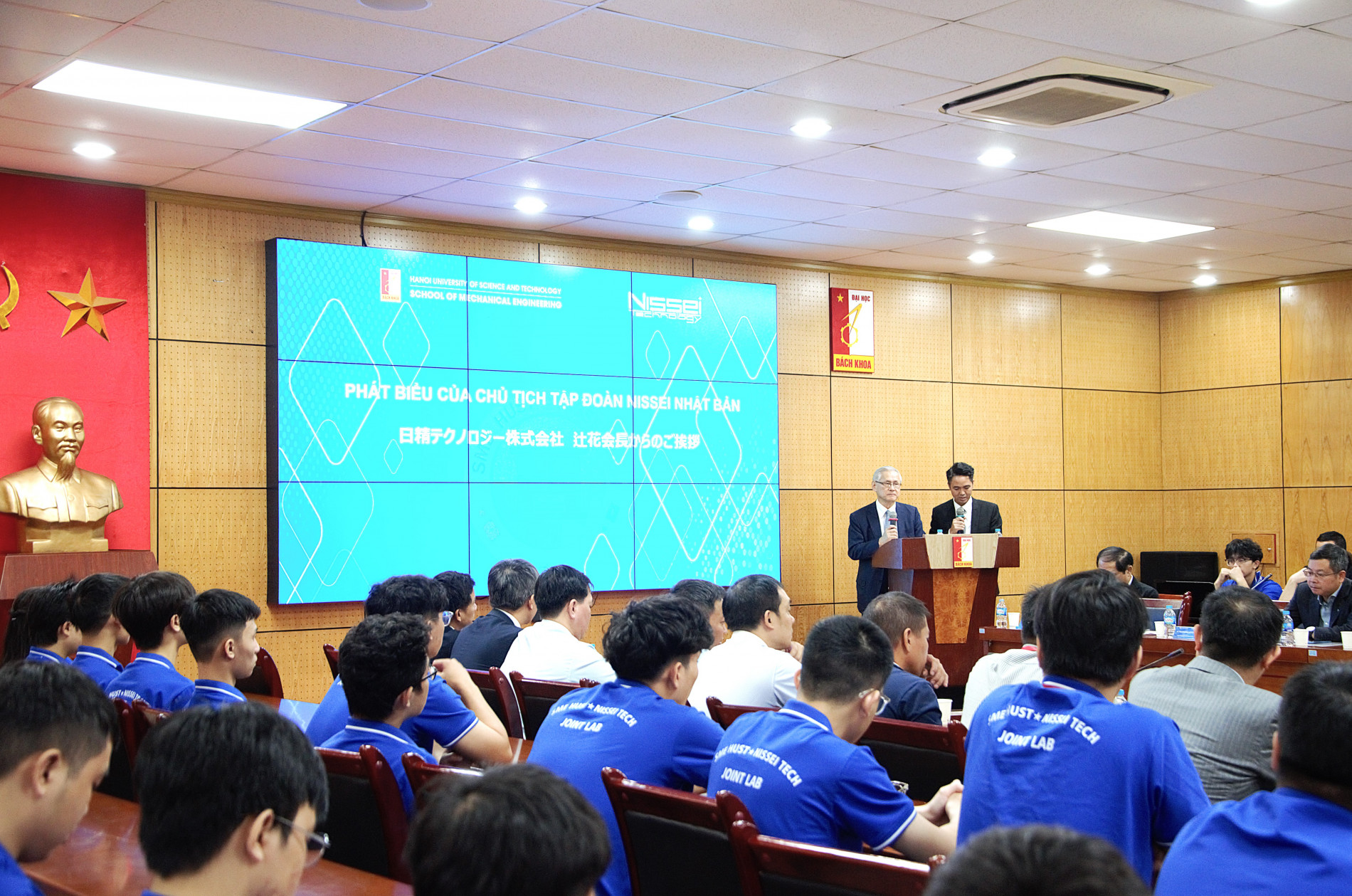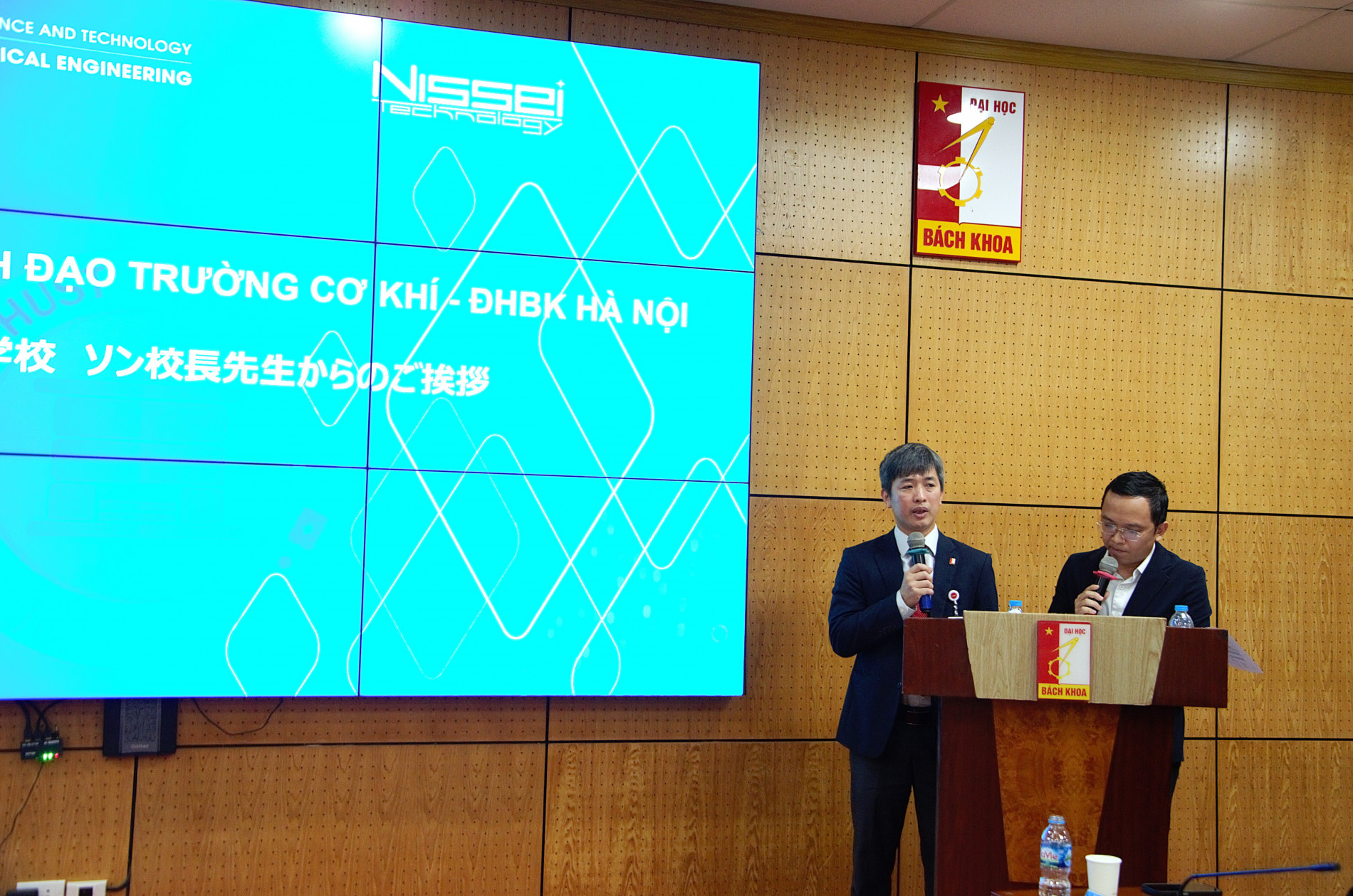 Khai mạc buổi lễ, PGS. Hoàng Hồng Hải - phó hiệu trưởng trường Cơ khí đã chào mừng các đại diện doanh nghiệp đến tham dự, đông thời chúc mừng những thành công của sự hợp tác giữa nhà trường với các công ty. Thầy Phó hiệu trưởng cảm ơn sự hỗ trợ nhiệt tình từ ngài Tsujihara Hitoshi - chủ tịch tập đoàn Nissei Nhật Bản, người đã kết nối các hoạt động hợp tác giữa các bên trong việc đào tạo sinh viên của Joint Lab. PGS. Hoàng Hồng Hải đã chia sẻ những chương trình kết nối của hai bên trong một năm vừa qua, đồng thời hy vọng những hoạt động này sẽ tiếp tục diễn ra nhiều hơn trong thời gian sắp tới, đặc biệt khi năm 2026 là kỷ niệm 70 năm thành lập Đại học Bách khoa Hà Nội cũng là kỷ niệm 20 năm thành lập Nissei Việt Nam.