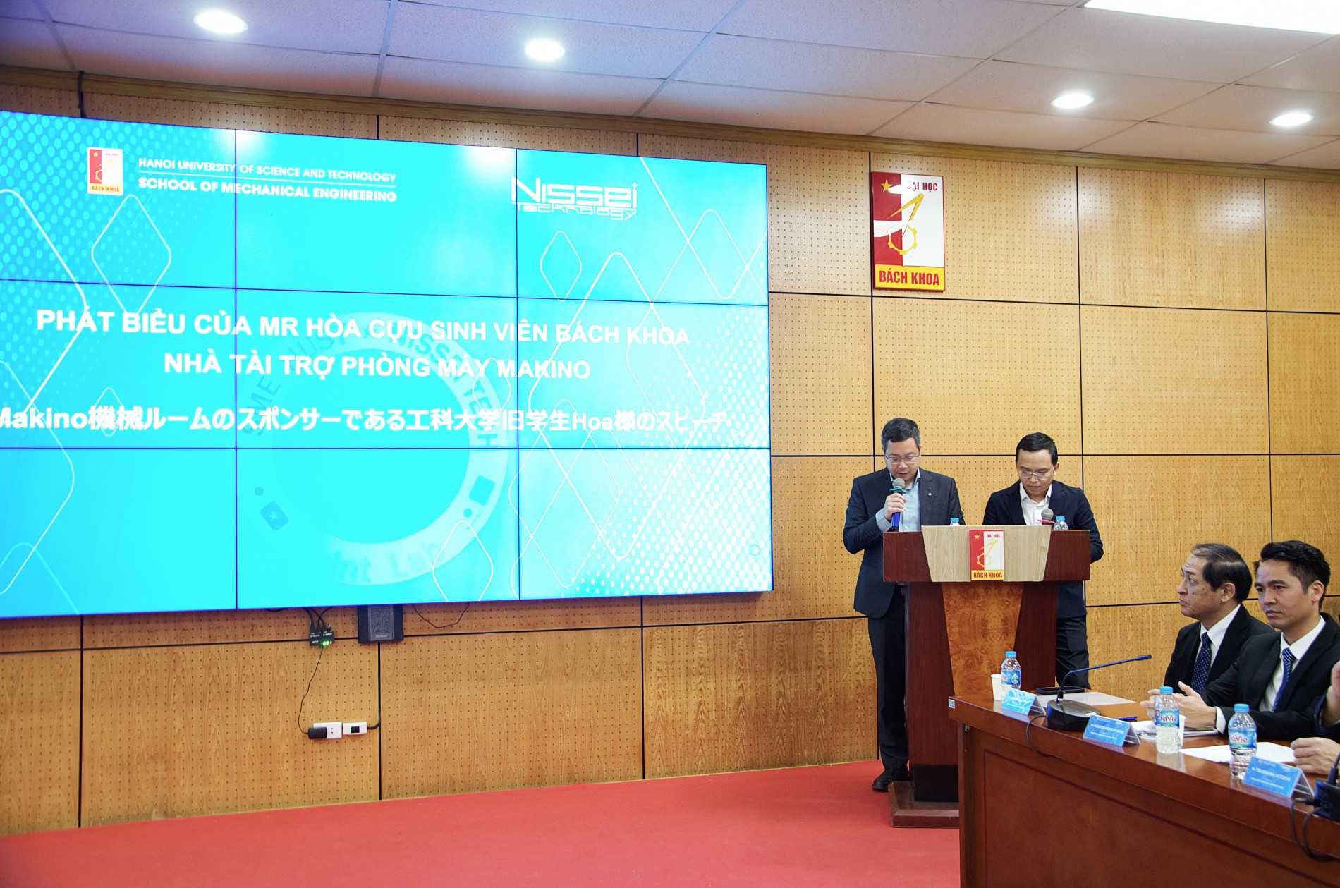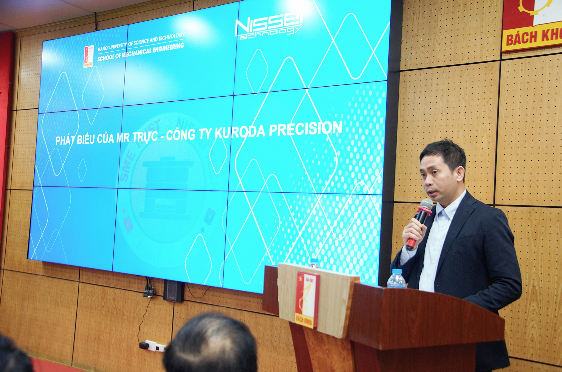 Tại buổi khai giảng, ông Nguyễn Thanh Hòa - Giám đốc phụ trách máy gia công, công ty MAkino Milling Machine, là đơn vị đối tác của Nissei Việt Nam đã hỗ trợ nhà trường xây dựng phòng thí nghiệm gia công CNC công nghiệp ngày 26/5/2025, đã chúc cá bạn sinh viên khóa 2 Joint Lab một năm học tập gặt hái nhiêu thành công. Ông chia sẻ trong suốt hành trình gần 90 năm thành lập và phát triển, Tập đoàn Makino luôn đề cao và quan tâm thực hiện các chương trình đào tạo nguồn nhân lực, một mặt để khẳng định tính trách nhiệm xã hội của tập đoàn, một mặt cũng để truyền tải và lan tỏa các thông tin công nghệ và kỹ thuật gia công cơ khí tiên tiến, và phát triển nguồn nhân lực cho cộng đồng. Với tư cách là một cựu sinh viên Đại học Bách khoa Hà Nội, ông Hòa đã gửi lời cảm ơn đến công ty Nisei Technology và Trường Cơ khí – ĐHBK Hà Nội đã tạo điều kiện cho Makino có cơ hội được tham gia vào chương trình vô cùng ý nghĩa này. Ông khẳng định phòng thí nghiệm CNC công nghiệp của Makino là một phần của Join Lab liên kết giữa Trường Cơ khí - ĐHBKHN cùngTập đoàn Nissei, đồng thời cũng cam kết sẽ đóng góp nguồn lực, cùng với các đối tác của mình tham gia tổ chức các chương trình đào tạo tốt nhất và thực tế nhất cho sinh viên.