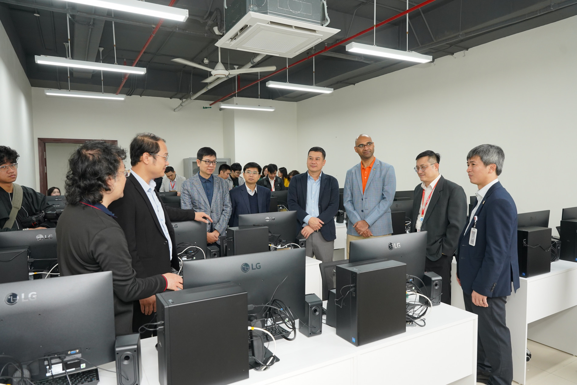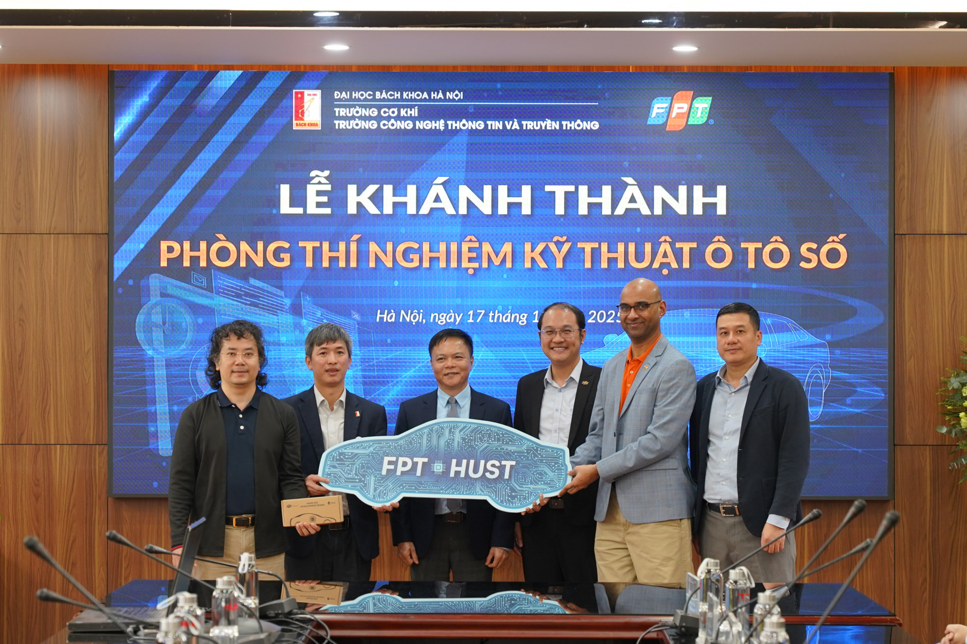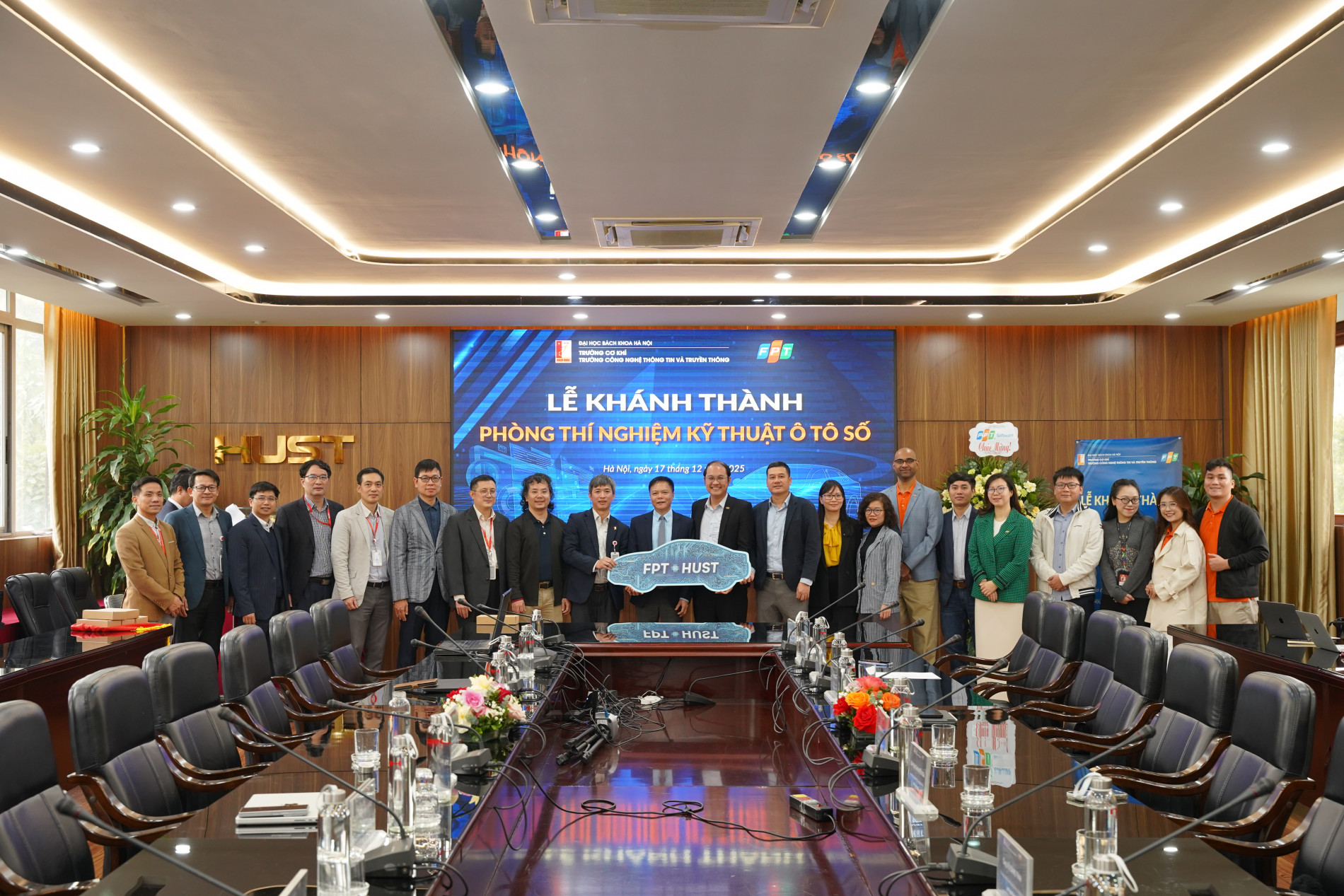 Đại diện Đại học Bách khoa Hà Nội và Tập đoàn FPT chụp ảnh lưu niệm tại buổi lễ khánh thành PTN Kỹ thuật Ô tô số.