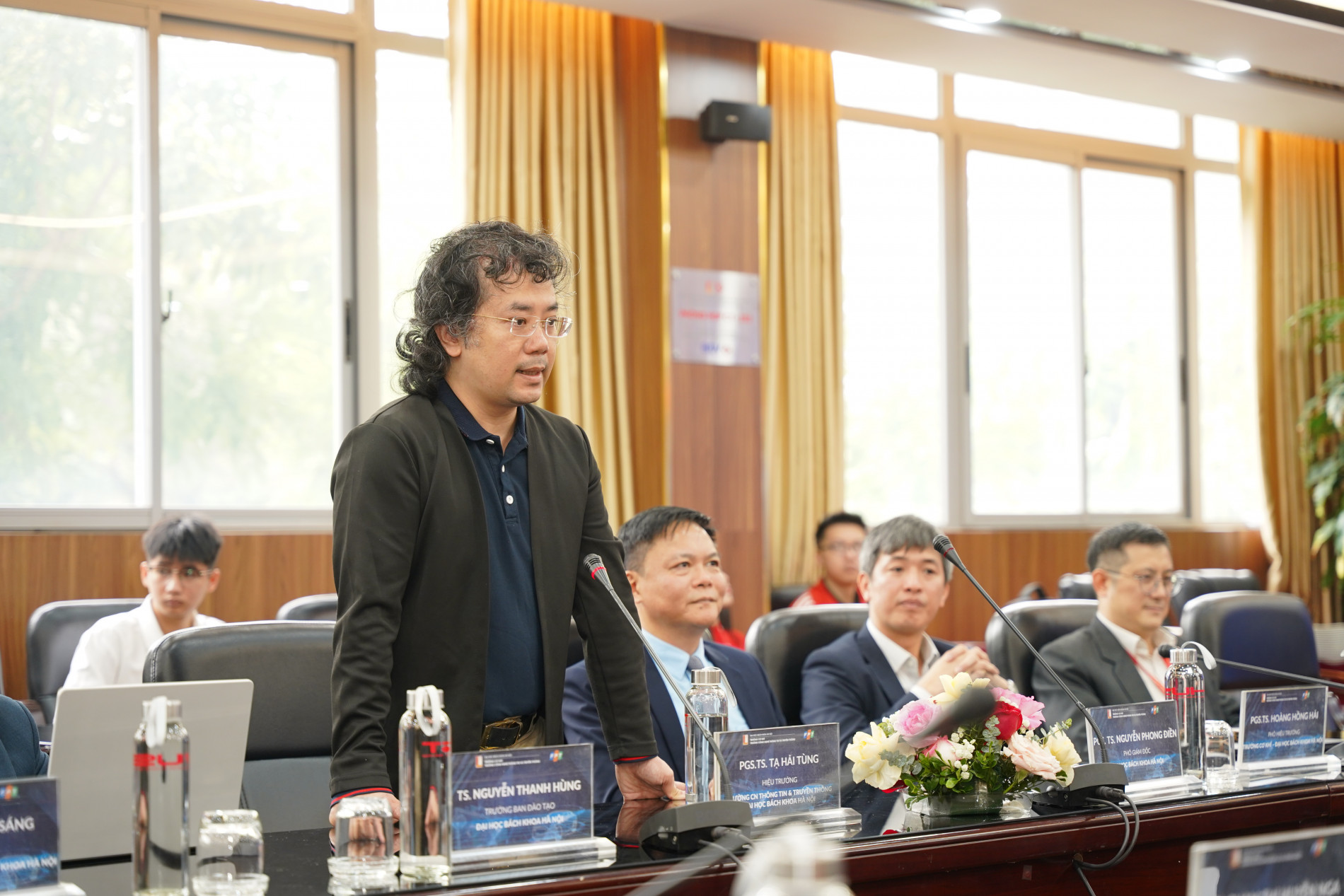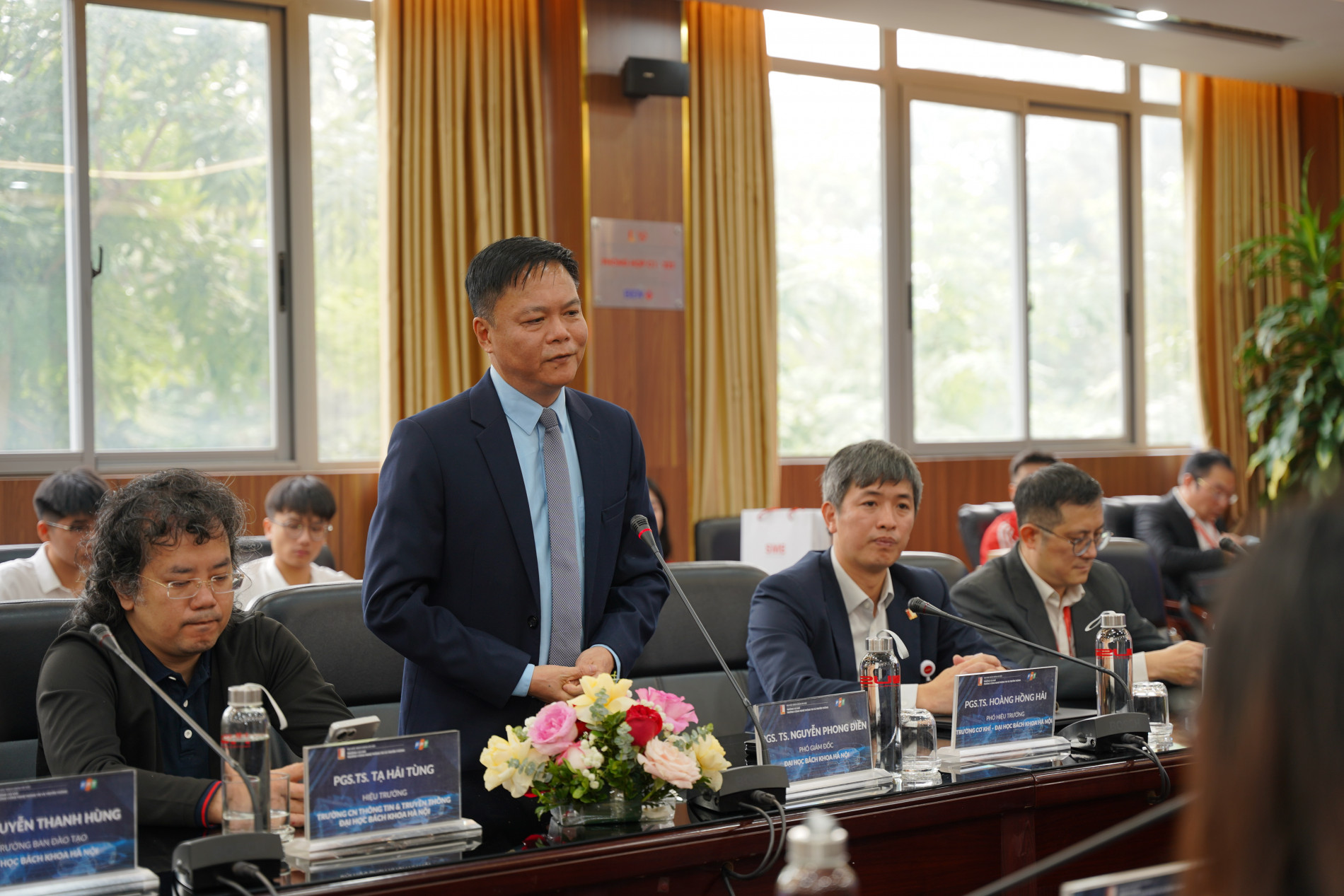 PGS. Hoàng Hồng Hải - Phó Hiệu trưởng Trường Cơ khí phát biểu trong buổi lễ, Chương trình đào tạo hướng tới khả năng thực chiến của các bạn sinh viên của nhà trường. PTN Kỹ thuật ô tô số được khánh thành dưới sự tài trợ của Tập đoàn FPT là rất cần thiết và thiết thực, giúp sinh viên tiếp cận, thực hành và triển khai nghiên cứu hướng tới doanh nghiệp. Đây là minh chứng cho sự kết nối, đồng hành và trách nhiệm của Tập đoàn FPT với Trường Cơ khí, Trường Công nghệ Thông tin và Truyền thông khi hợp tác xây dựng và phát triển chương trình.