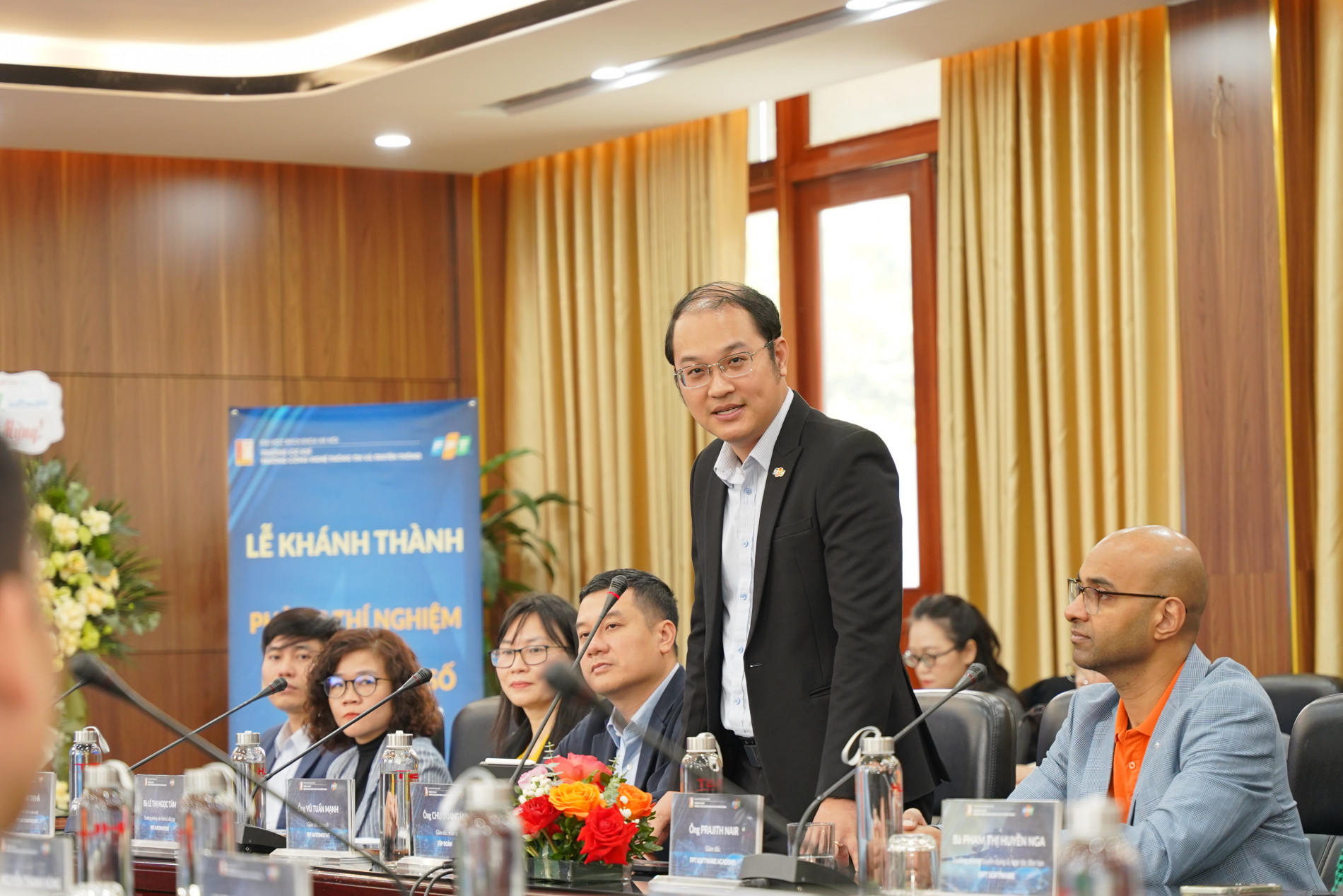 Phát biểu khai mạc buổi lễ, PGS. Nguyễn Phong Điền - Phó giám đốc Đại học Bách khoa Hà Nội đã chia sẻ: ĐHBKHN đã xây dựng nhiều chương trình kỹ sư chuyên sâu đặc thù, với mong muốn các bạn sinh viên được trải nghiệm thực tiễn sản xuất và tạo dựng được nguồn lao động chất lượng cao đáp ứng nhu cầu thay đổi liên tục của sản xuất. Thầy Phó giám đốc rất vui mừng bởi sự kiện khánh thành phòng thí nghiệm ngày hôm nay, đây là phát triển của chương trình hợp tác giữa hai trường với tập đoàn FPT trong việc xây dựng chương trình đào tạo kỹ thuật ô tô số. Đây là khẳng định sự hợp tác phát triển của nhà trường với các đơn vị doanh nghiệp trong việc đào tạo và phát triển nguồn nhân lực chất lượng cao.