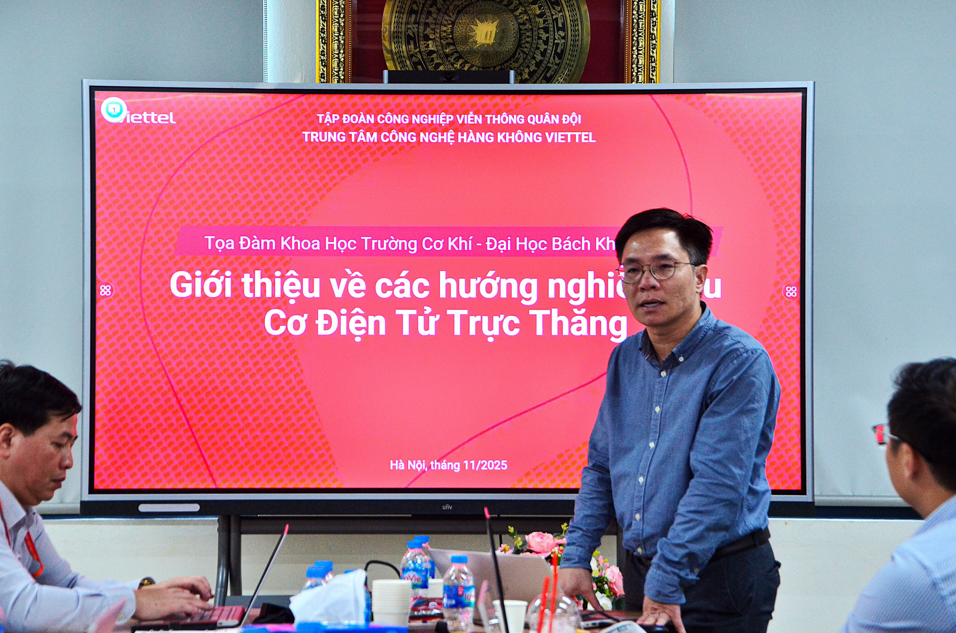 Đến với buổi Tọa đàm, TS. Nguyễn Tuấn Anh - Kỹ sư chính, Trưởng nhóm Điện tử Hàng không, trung tâm Công nghệ Hàng không Viettel (VATC), Tập đoàn Viettel, đã trình bày về các định hướng nghiên cứu Cơ điện tử trên máy bay trực thăng. TS. Nguyễn Tuấn Anh chi sẻ máy bay trực thăng là một thiết bị công nghệ cao với rất nhiều hệ thống Cơ điện tử được liên kết với nhau như hệ thống điều khiển lái, hệ thống định vị, hệ thống thông báo … với điều kiện an toàn rất cao. Với đặc thù của đơn vị, hiện nay trung tâm đang đầu tư xây dựng nhiều nhóm nghiên cứu để thực hiện các nhiệm vụ nghiên cứu phát triển và nội địa hóa các công nghệ trên máy bay. Với yêu cầu mở rộng phát triển của trung tâm hiện nay, cần tuyển dụng rất nhiều kỹ sư xuất sắc trong ngành Cơ điện tử, Cơ khí, Hàng không … về làm việc. Đồng thời, ông cũng đề nghị một số định hướng hợp tác giữa nhà trường và Tập đoàn trong nghiên cứu và đào tạo nhân lực như việc nhà trường có thể thành lập các tổ chuyên gia tư vấn, đánh giá; cùng tìm hiểu các đề tài nghiên cứu chung giữa hai bên; giới thiệu và tuyển dụng cho Tập đoàn các sinh viên xuất sắc; tổ chức hợp tác liên khoa, liên ngành trong nghiên cứu và đào tạo nghiên cứu sinh, cao học; nhà trường hỗ trợ liên kết các doanh nghiệp tạo ra những cơ sở gia công và đo kiểm;…