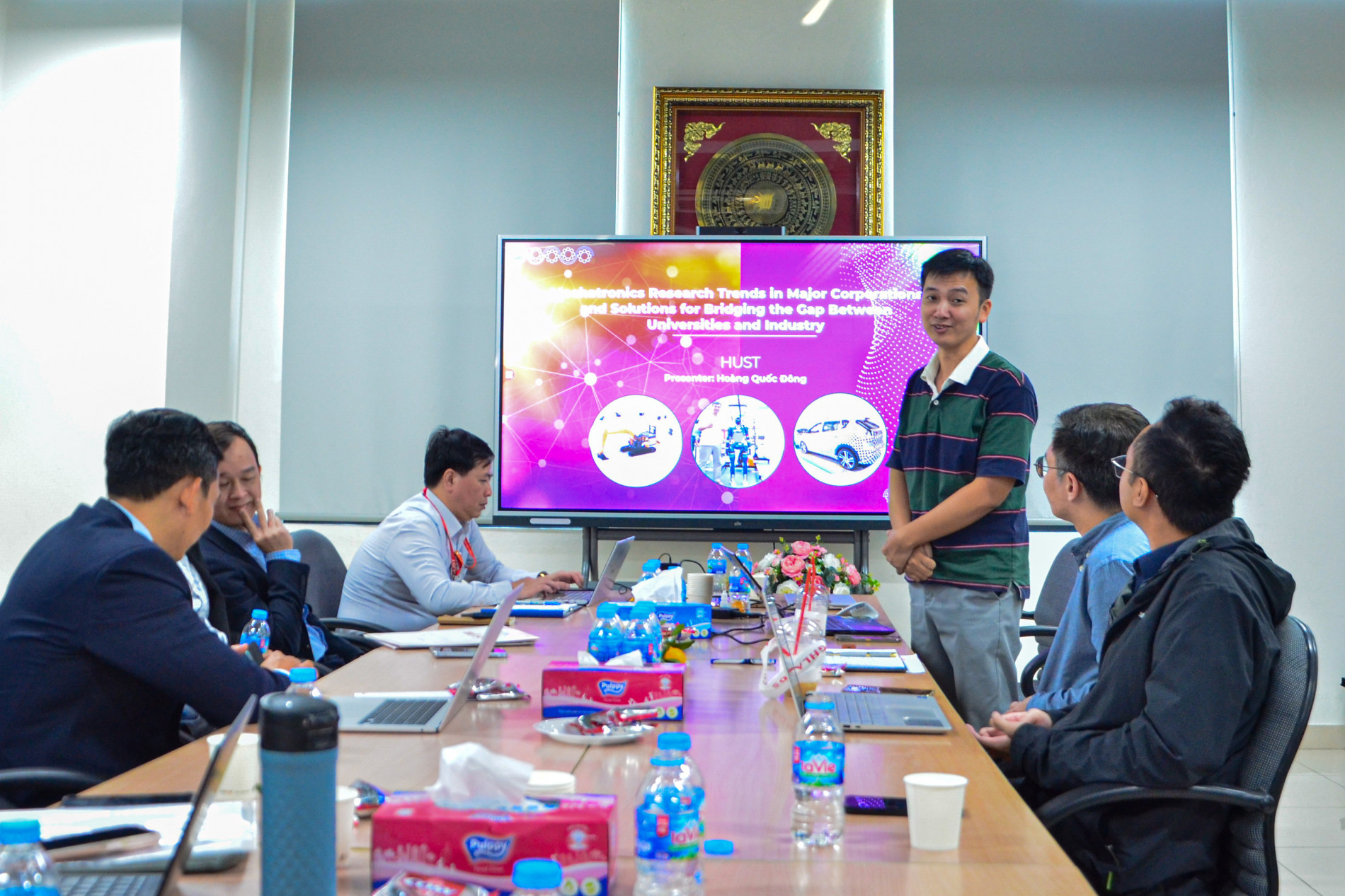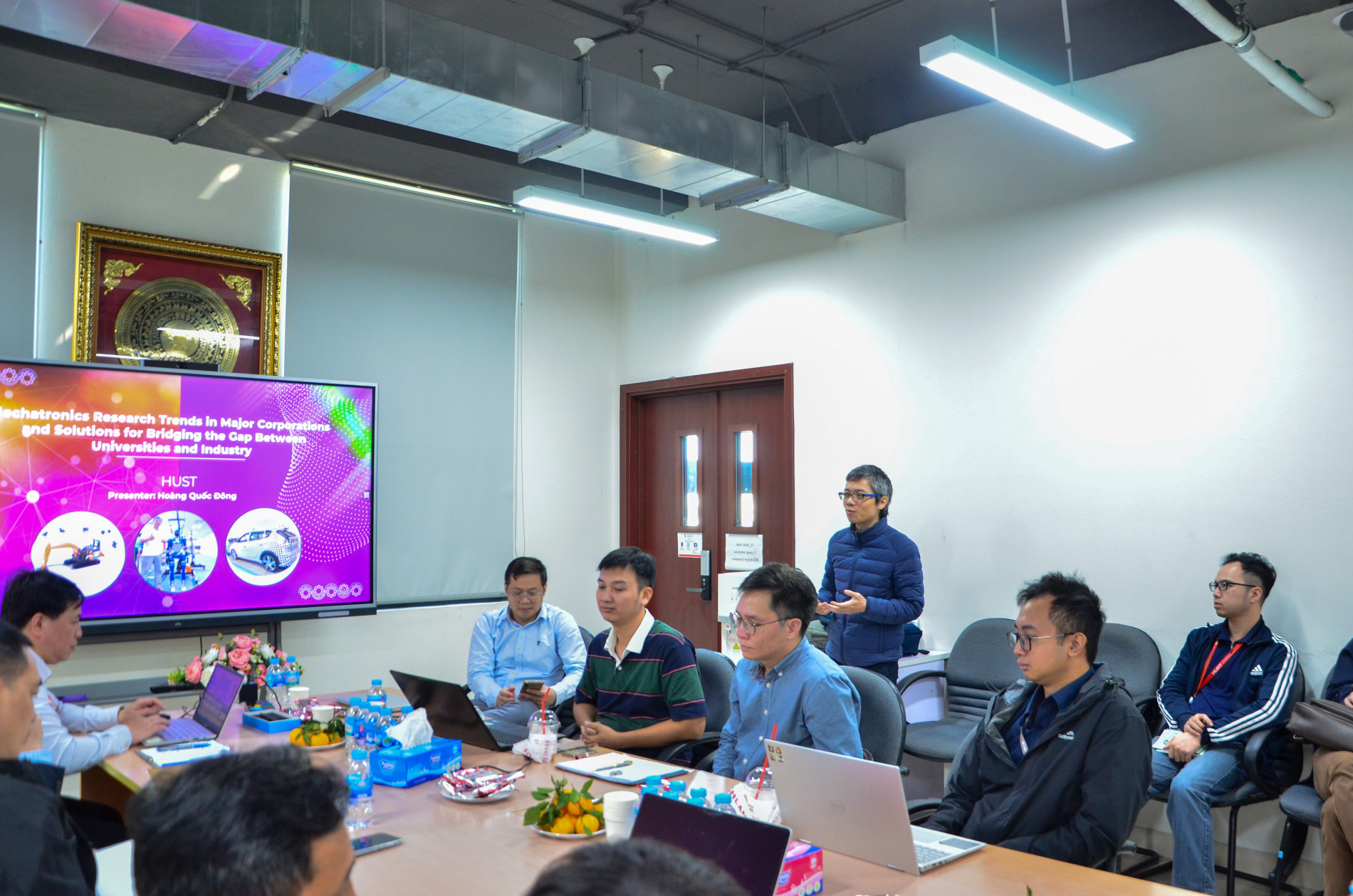 Tại buổi tọa đàm, TS. Hoàng Quốc Đông đã giới thiệu một số hướng nghiên cứu về Cơ điện tử tại các tập đoàn lớn trên thế giới và Việt Nam. Với những kinh nghiệm làm việc nhiều năm trong lĩnh vực Cơ điện tử, điều khiển công nghệ cao và robot tại các dự án cho những công ty lớn của Hàn Quốc (như Samsung, Hyundai, LIG Nex1, Erae Automotive) và một số doanh nghiệp tại Việt Nam (như Vinmotion, Samsung Display Việt Nam),… TS. Đông đã đưa ra một số đề nghị trong việc xây dựng các định hướng phát triển nghiên cứu Cơ điện tử ứng dụng có thể được thực hiện tại nhà trường hoặc hợp tác cùng phát triển với các doanh nghiệp đối tác.